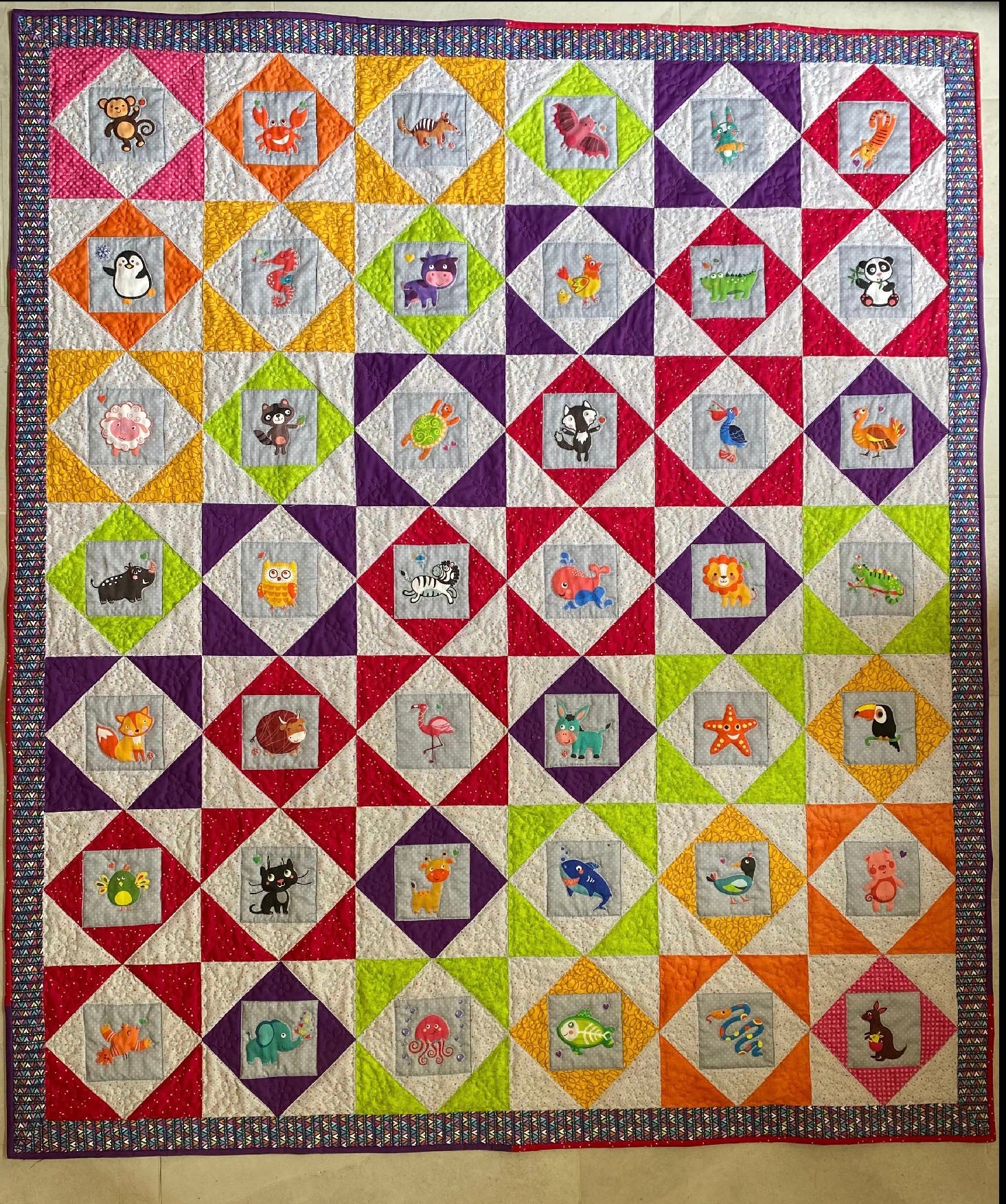 This block’s structure — a central square framed by triangles that form another square — made an efficient use of small pieces and fabric remnants.
